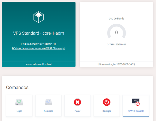 O NoVNC é uma ferramenta integrada ao painel do cliente que permite acessar o console do seu VPS diretamente pelo navegador, sem a necessidade de programas adicionais como SSH ou RDP.